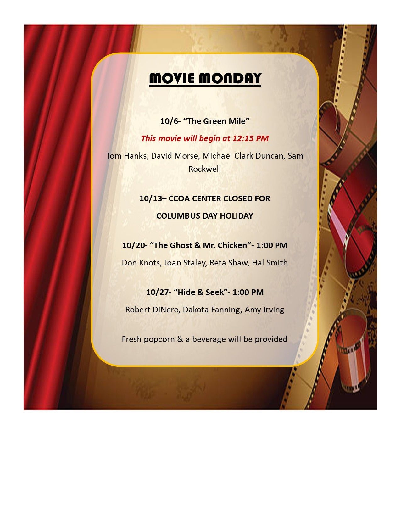 Fresh popcorn & a beverage will be available for your movie going enjoyment.